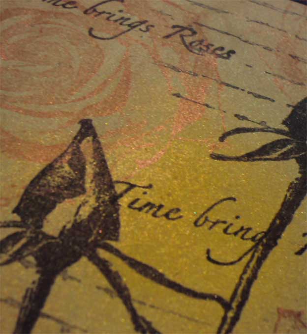 Het jaar maar eens goed beginnen met een uitdaging. Dit keer van Art Journey. AJ-Challenge nummer 17 met het thema: Perfect Pearls.Ik heb voor de set Roses gekozen. Kaart bedrukt met Versamark, in het midden Pearl-Ex Yellow en aan de randen Green Spring. Beetje vochtig gespoten en uitgesmeerd. Met Versamark de grote rozen gestempeld, 2x dik en 2x vager. Hierover Pearl-Ex Red Russet geveegd. in de lucht met water gespoten en hier de kaart door gehaald om de Pearl-Ex te fixeren. tot slot met Archival Ink Jet black de rozen op steel en de tekstjes gestempeld.